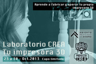 El laboratorio CREA tu impresora 3D empezó como una experiencia parte del primer Abierto Mexicano de Diseño en el año 2013, en donde los participantes aprendieron a construir y operar su propia impresora 3D que además es capaz de auto replicarse (a excepción de los componentes electrónicos y de piezas que pueden comprarse muy fácilmente en la web).